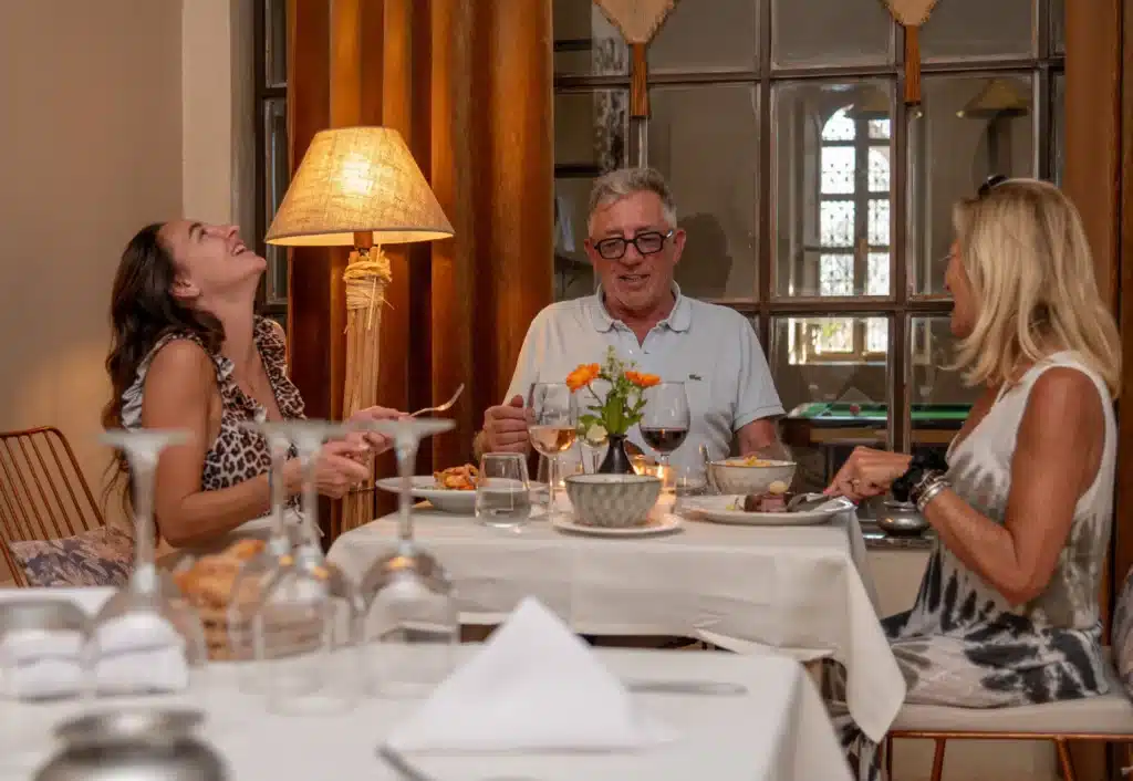 À l’intérieur du restaurant, chaque détail reflète l’élégance de l’art de vivre marocain. Bois sculpté, lanternes délicates et éclairage chaleureux créent une ambiance intime et raffinée. Une musique douce accompagne le service attentif de l’équipe, renforçant ce sentiment de sérénité que recherchent les voyageurs lorsqu’ils viennent vivre un brunch à Marrakech dans un cadre d’exception.