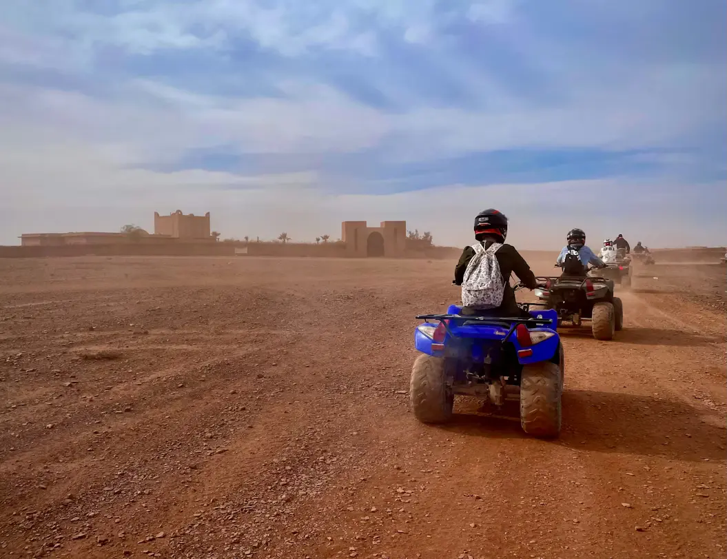 Les circuits permettent de parcourir de vastes zones du désert d’Agafay, d’atteindre des points de vue panoramiques et de découvrir des zones moins accessibles à pied. Les excursions sont systématiquement encadrées par des guides professionnels, avec des briefings de sécurité et des parcours adaptés aux débutants comme aux conducteurs plus expérimentés.